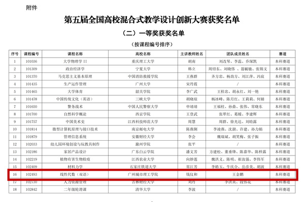 本网讯(记者 黄凤娟 高睿一)11月20日,第五届全国高校混合式教学设计创新大赛公示结束,我校国际商学院钱仪和、王金鹏教师团队的“线性代数(双语)”课程在进入复赛的1123个团队、3859名教师中脱颖而出,荣获大赛一等奖。