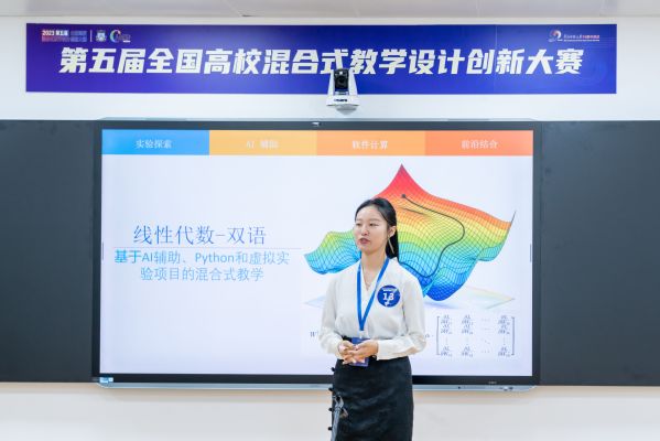 决赛时,钱仪和作为我校团队代表与清华大学、南京大学等大学教师代表同组竞技。面对劲敌,她从容不迫,沉着应对,稳健自信的台风,对评委们的提问有条不紊的回答让她获得现场的一致好评。《线性代数(双语)》经过6轮的教学,在团队老师不断探索下,课程逐步形成了实验探索结合概念讲授、AI辅助自学、软件计算结合手动计算、前沿应用结合理论学习等鲜明的特色,将传统授课方式转变为让学生自己提问和探索的学习方式,促进学生与知识的更深层次的互动,使学生根据识别出的不足进行针对性学习。2022年,本课程被认定为“广东省一流本科课程(线上线下混合式一流课程)”。