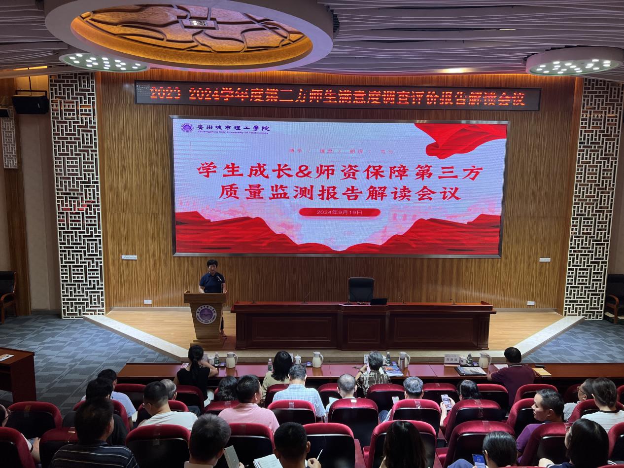 为完善我校本科教学质量保障体系,保障和提高人才培养质量,深入了解我校师生对学校教育、教学、管理、服务等方面的工作情况,2024年9月19日下午学校在行政楼703会议室组织召开2023-2024学年度第三方师生满意度调查评价报告解读会议。副校长刘洊波、魏德敏,相关机关部处的负责人,各学院(部)的院长、书记、副院长、教研室主任及专业带头人参加。会议由教学质量管理处处长王全迪主持。